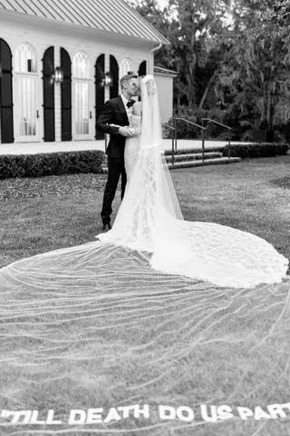 Gaun ini sudah terang-terangan menyiratkan makna penting. Pada veil transparan, tertulis “Till Death Do Us Part” dengan huruf khas Virgil Abloh, serta sulaman mutiara bertuliskan “Wedding dress.” Detail ini menunjukkan bahwa cinta mereka bukan sekadar upacara, melainkan janji seumur hidup.