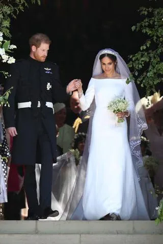 Gaun Meghan penuh arti: motif bunga pada kereta gaun melambangkan 53 negara persemakmuran, ditambah bunga lupin California sebagai penghormatan pada tempat kelahirannya. Gaun ini bukan sekadar simbol estetika, tapi juga penggabungan akar global dan personal.