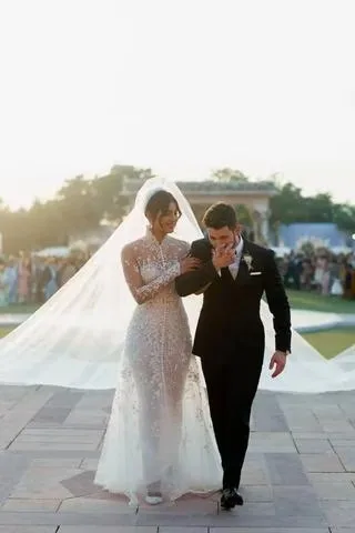 Gaun pernikahan Priyanka penuh simbol. Dibuat khusus oleh Ralph Lauren, gaun ini disulam kristal Swarovski dan memuat delapan kata yang dipilih sendiri oleh sang aktris, seperti “Hope”, “Compassion”, dan tanggal pernikahan mereka, 1 Desember 2018.